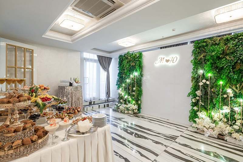 Меню в «Гранат Hall» банкетное и составляется накануне события на основе предпочтений гостей. Для свадебной вечеринки чаще всего заказывают русские соленья и салаты, в качестве закусок выбирают ассорти из греческих оливок, итальянского сыровяленого мяса и домашних сыров, а на горячее берут шашлык, кебабы, приготовленные в лучших традициях кавказской кухни, или праздничные блюда — например, азербайджанский Шах-плов с сухофруктами, целиковую стерлядь под апельсиновым соусом, запеченных утку или поросенка. Конечно, ни одно торжество не обходится без финального десертного штриха — в «Гранат Hall» это предусмотрели и готовы изготовить торт на любой вкус. Свежие фруктовые и ягодные, нью-йоркские чизкейки, классический «Наполеон» или «Медовик» — все на выбор заказчика.