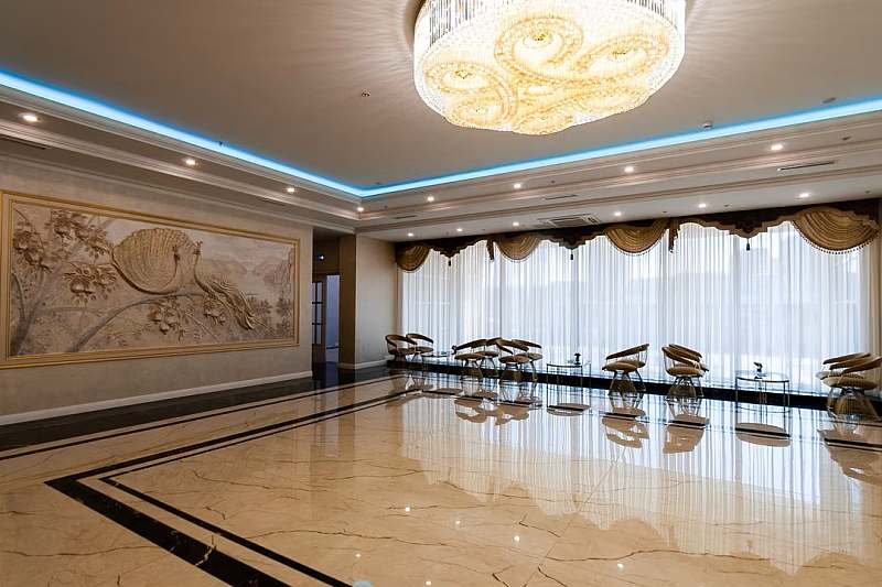 Банкетный комплекс «Гранат Hall» разделен на два зала: большой, рассчитанный на 350 человек, и маленький, с посадкой на 80 персон. Каждая зона оформлена индивидуально. Зал на 80 посадочных мест выполнен в классицистическом стиле с отсылкой к морской тематике: бархатные портьеры цвета ночного неба, пол из темного мрамора с витиеватыми белыми узорами, словно морская галька, и прозрачная, как капли воды, мебель. Зал на 350 персон выполнен в традициях классического стиля, но с элементами барокко: пол выложен белым кафелем с шоколадными вставками из испанского мрамора, стены украшены панно в золотых рамах, потолок двухуровневый, с элементами лепнины и внутренней подсветкой. В отличие от маленького зала в большом также есть сцена — на ней можно установить музыкальную аппаратуру и организовать полноценную концертную зону.