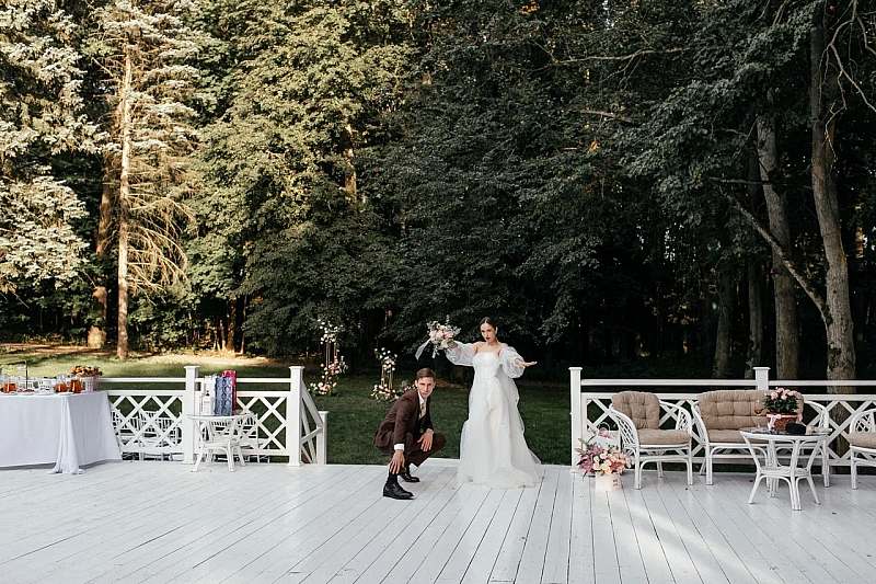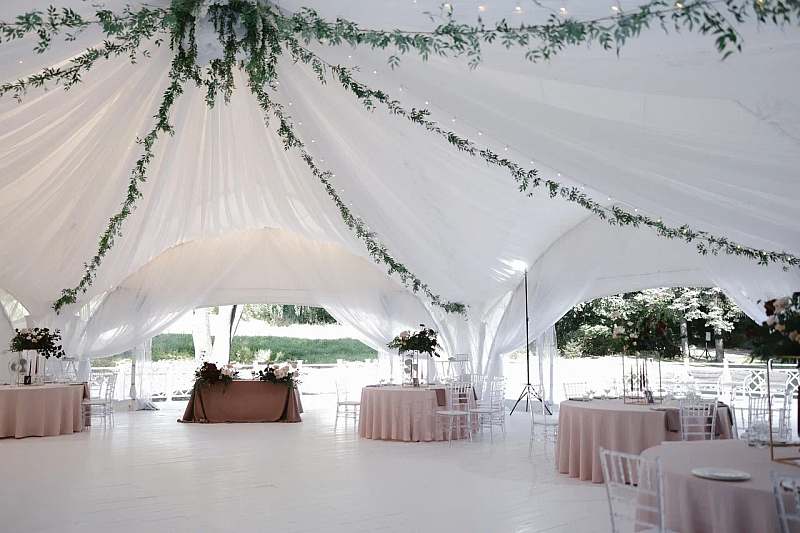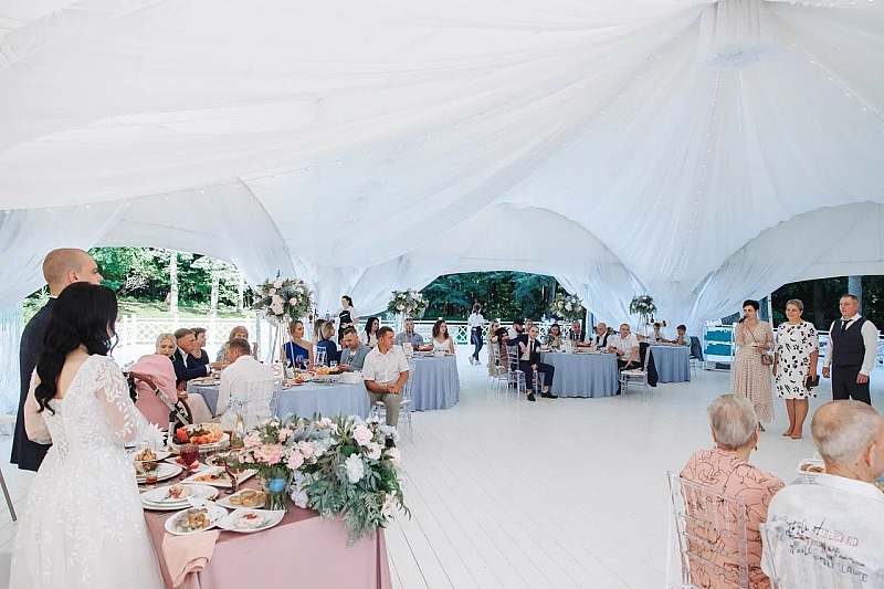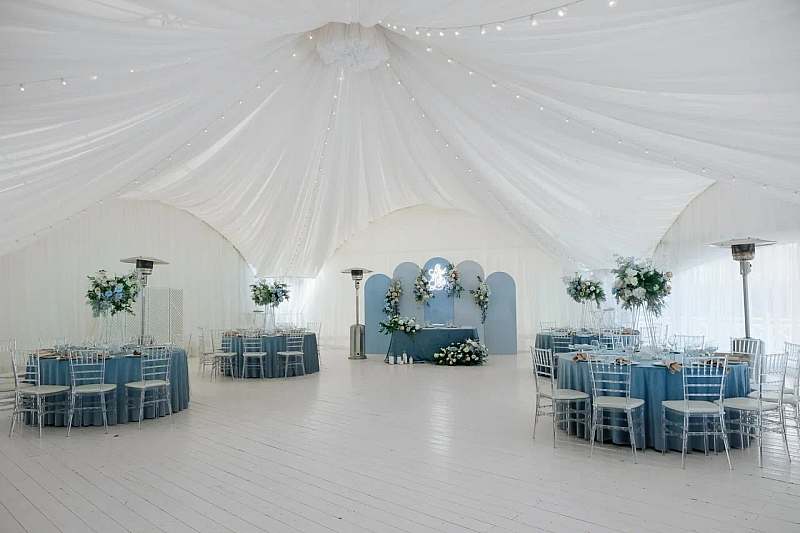 Шатёр вмещает до 120 гостей и располагается на подиуме, размером 700 квадратных метров. Подиум прекрасно подходит для проведения церемонии выездной регистрации, welcome-зоны и отдыха.