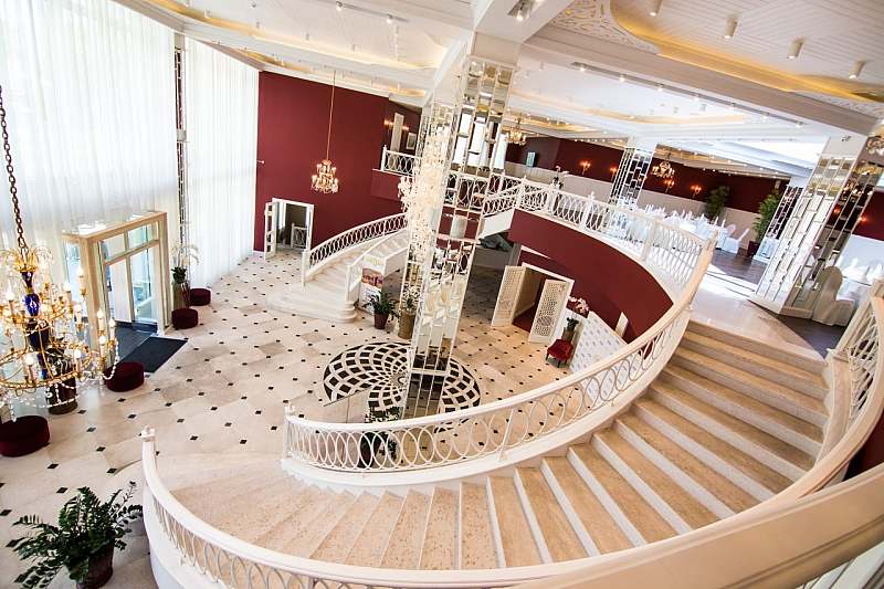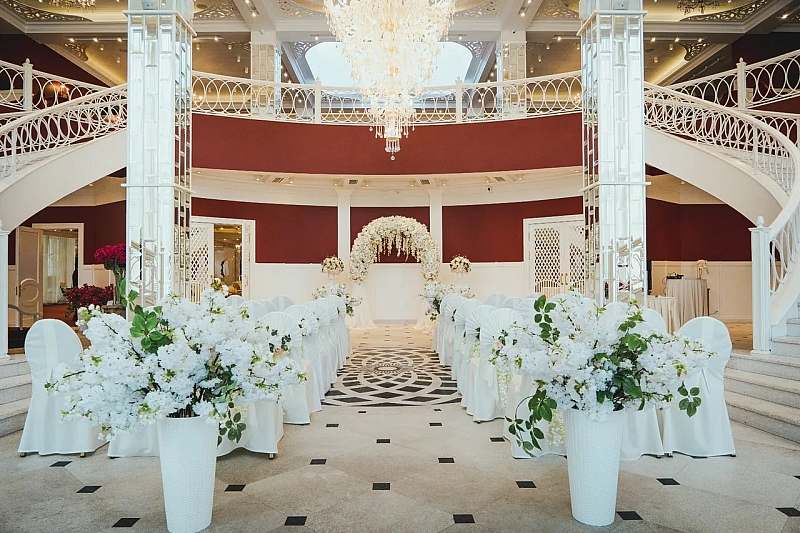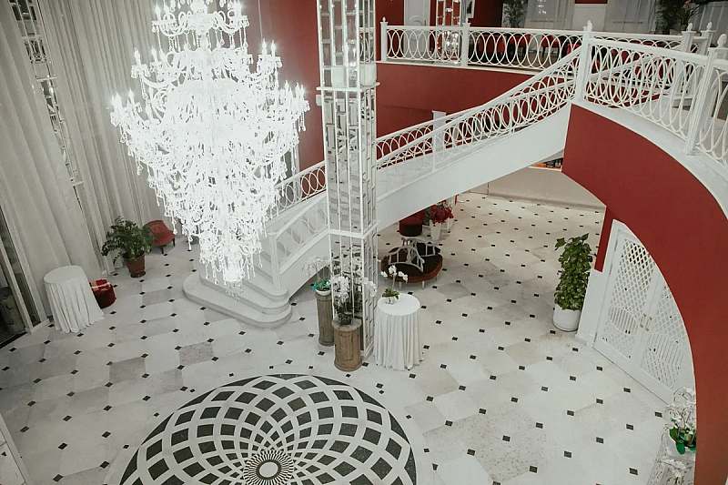 Гостей встречает парадный мраморный холл с расходящимися лестницами и витражными окнами — здесь проводят welcome, фуршеты, церемонии и эффектные фотосессии. Главный банкетный зал с высокими потолками, массивными люстрами, лепниной и балконами рассчитан на мероприятия до 450 человек и напоминает зал дворцовых приёмов прошлых эпох. Дополняет пространство открытая терраса с видом на парк, которая особенно востребована в тёплый сезон для выездных регистраций, фуршетов и лаунж‑зоны на свежем воздухе.