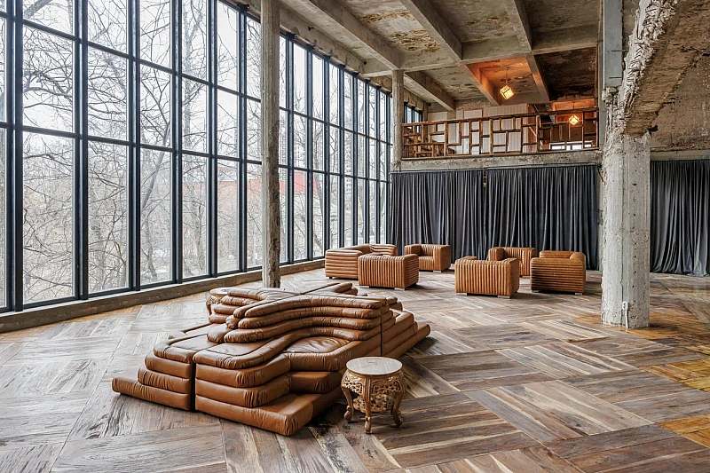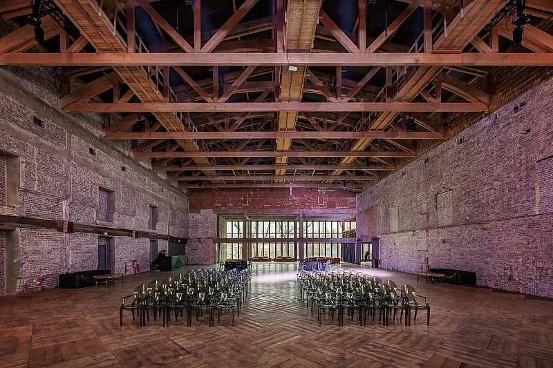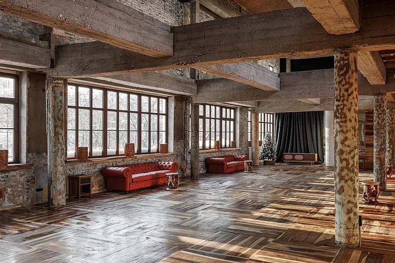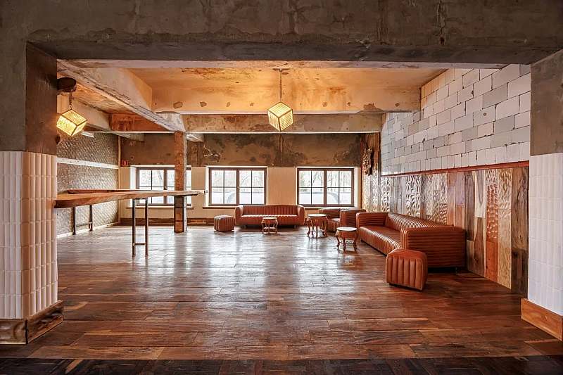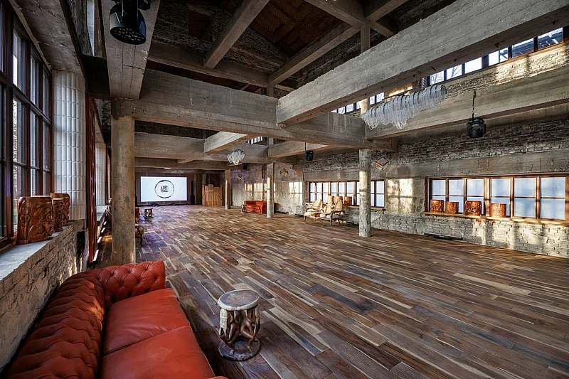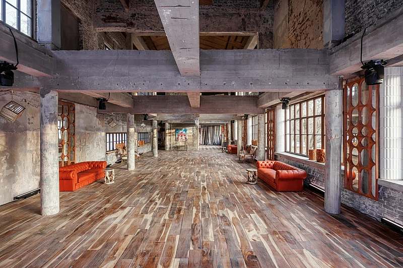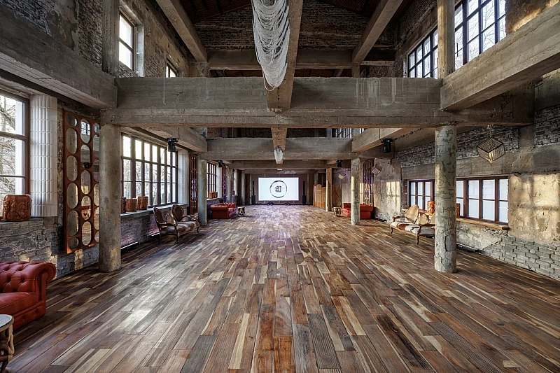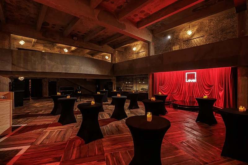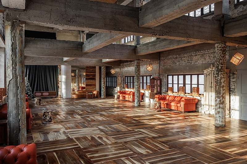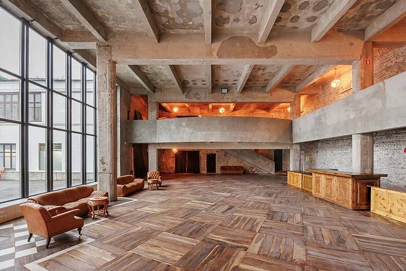 Основной зал MAIN HALL представляет собой масштабное индустриальное пространство с высокими кирпичными стенами и деревянными балками под потолком. Высота потолков около 13 метров усиливает ощущение масштаба, а большие окна и геометричная планировка подчёркивают стиль конструктивизма и добавляют залу воздуха и света. В отделке сочетаются бетон, кирпич, мраморное покрытие пола и тёплый деревянный паркет, благодаря чему интерьер выглядит минималистично, но при этом статусно и фотогенично.