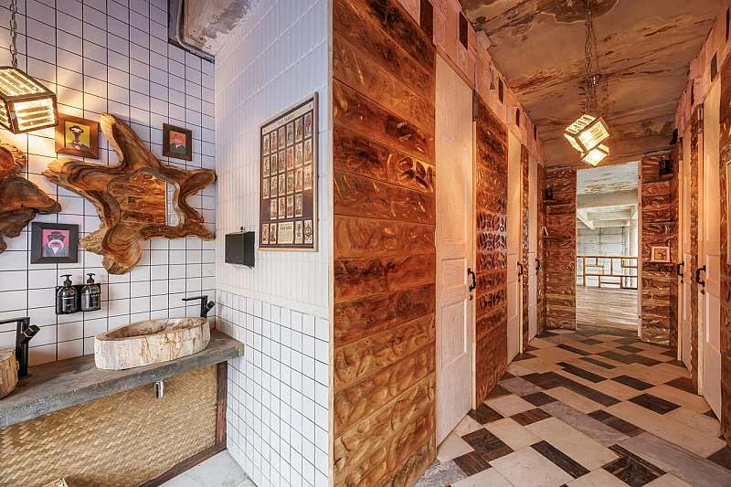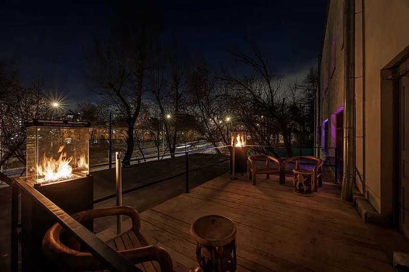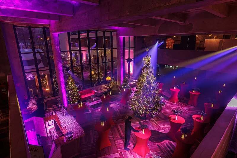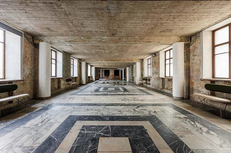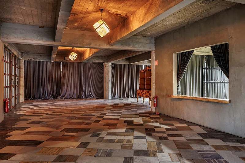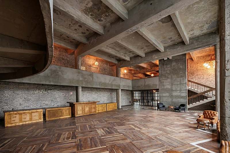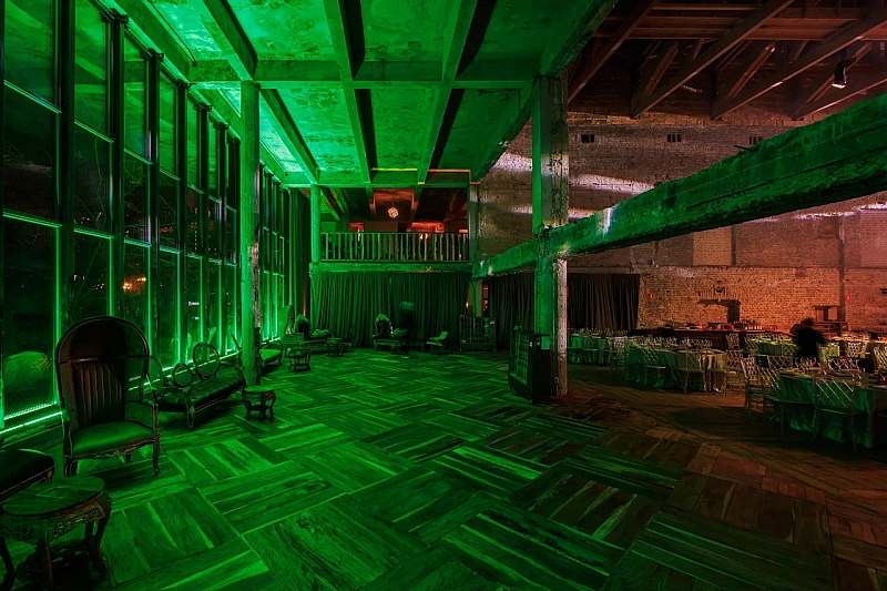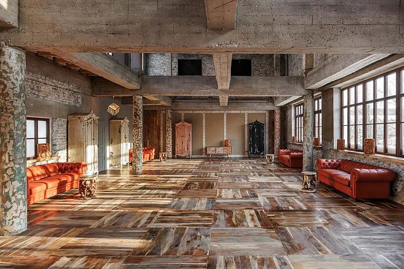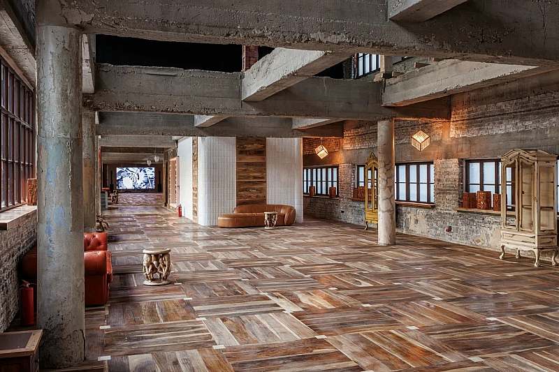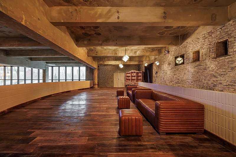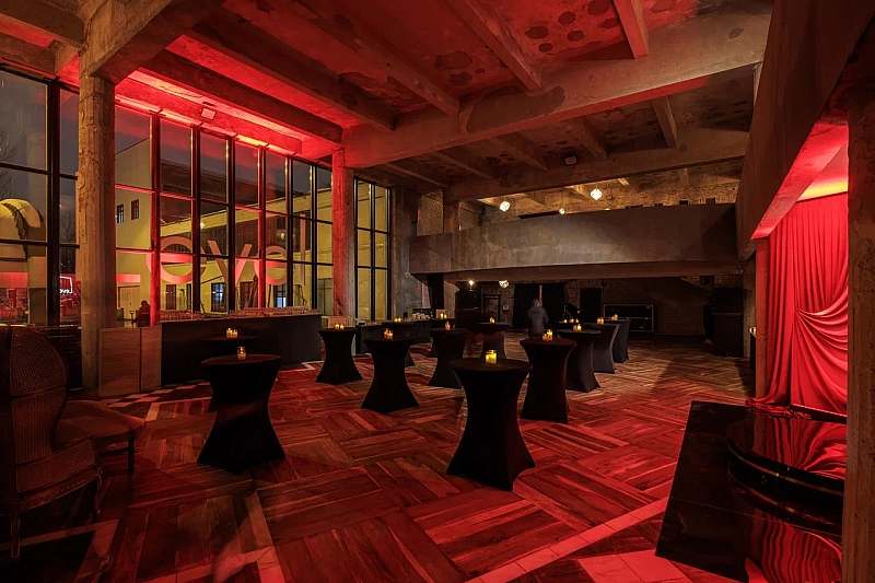 Основной зал MAIN HALL представляет собой масштабное индустриальное пространство с высокими кирпичными стенами и деревянными балками под потолком. Высота потолков около 13 метров усиливает ощущение масштаба, а большие окна и геометричная планировка подчёркивают стиль конструктивизма и добавляют залу воздуха и света. В отделке сочетаются бетон, кирпич, мраморное покрытие пола и тёплый деревянный паркет, благодаря чему интерьер выглядит минималистично, но при этом статусно и фотогенично.