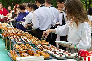 Помимо основного зала, ресторан использует видовые площадки для зоны welcome, выездной церемонии и детскую комнату, которую при необходимости можно задействовать под артистов или технический персонал. Такое зонирование позволяет комфортно разделять официальную часть, банкет, фотозоны и активности для детей.