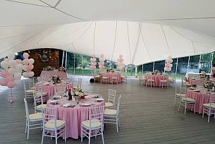 Яхт-клуб Пеликан идеально подходит для проведения свадебных церемоний в атмосфере изобилия и роскоши. Очаровательный летний шатер, общей площадью 400 кв. м., декорированный тканью в пастельных тонах, с люстрой в стиле шебби-шик, вмещает до 200 гостей в формате «Банкет».