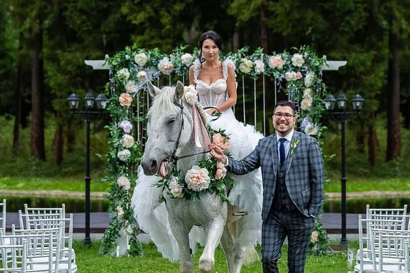 Приветственный фуршетный стол можно накрыть у пруда, а на зеленой лужайке устроить стильную фотозону для свадебных фотосессий. Героями фотосессии могут стать наши милые питомцы – обитатели эко-фермы: лошади из конного клуба или белые пушистые кролики, все они очень любят позировать в торжественные моменты.