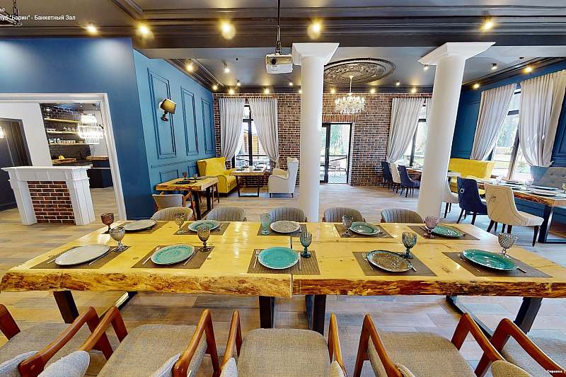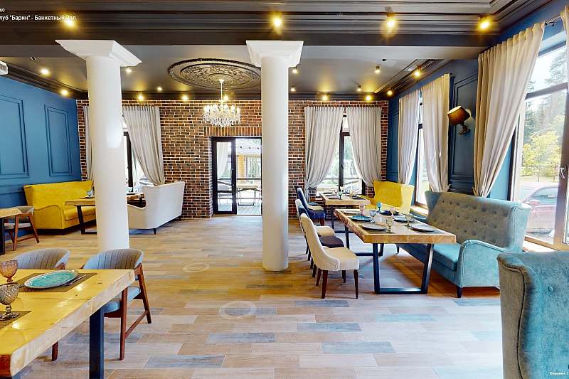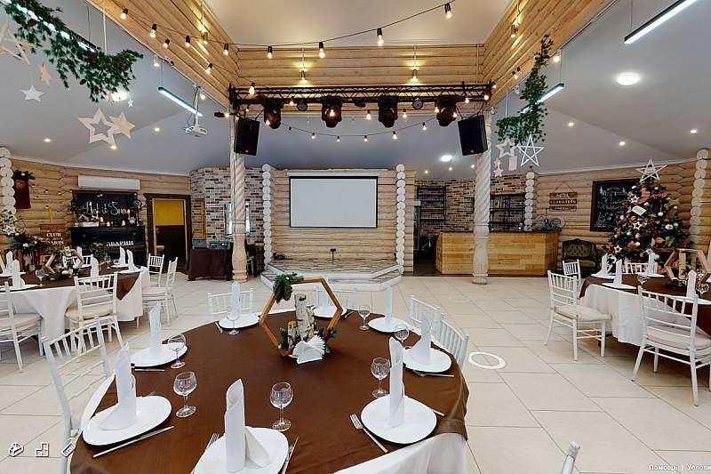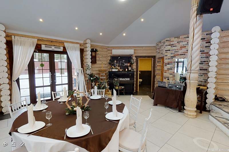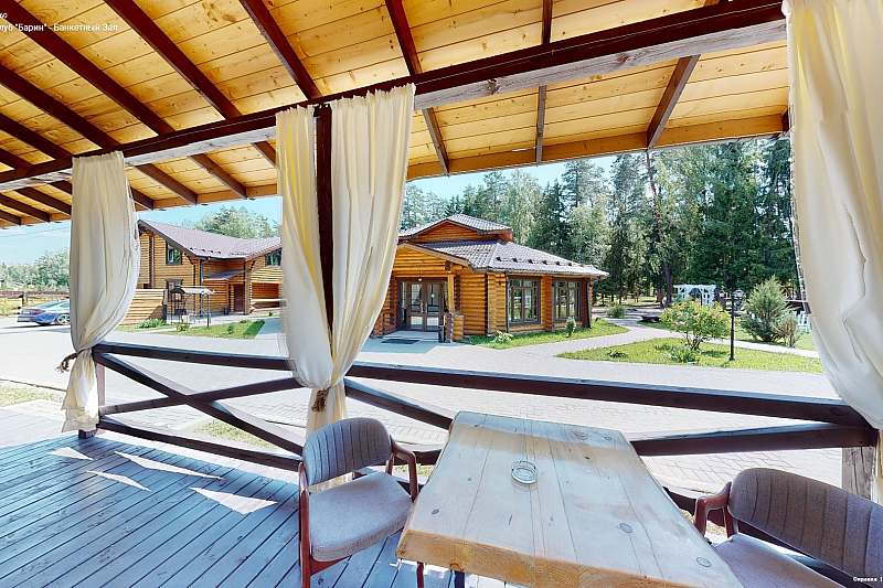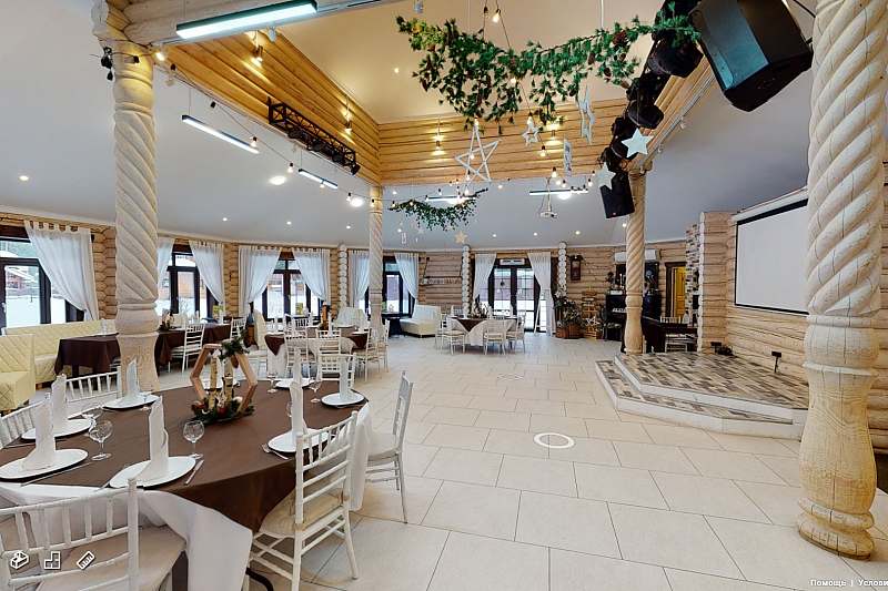 Банкетный зал с панорамными окнами вмещает до 80 гостей. Летом окна можно открыть, превратив зал в роскошный шатер для свадьбы, а зимой любоваться зимним лесом, сидя в тепле и уюте за красиво накрытым столом.