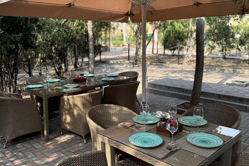 Уютная летняя веранда в парке, в тени деревьев - отличное место для проведения свадеб, семейных посиделок в волшебном пространстве на свежем воздухе.