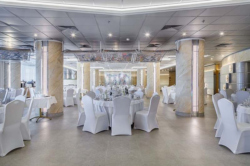 Архитектурной доминантой зала являются величественные колонны, придающие пространству торжественный и благородный вид. Палитра тёплых бежевых тонов декоративных элементов и обилие света из множества окон создают атмосферу современной классики — элегантной, светлой и невероятно просторной.