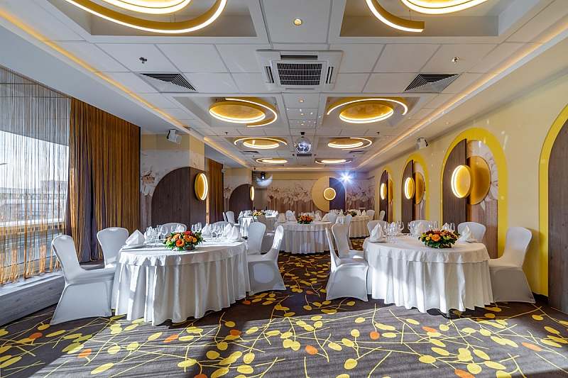 Многофункциональный зал «Осень» - это тщательно продуманное пространство площадью 95 м2 для самых важных моментов Вашей жизни, место, где царят тепло, свет и радость! Оригинальный дизайн, выполненный в золотисто-желтых цветах золотой осени, способен украсить и стать достойным обрамлением для важного мероприятия Вашей жизни.