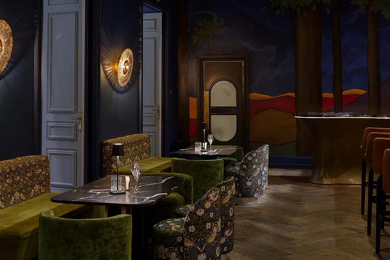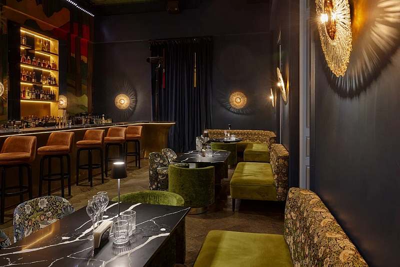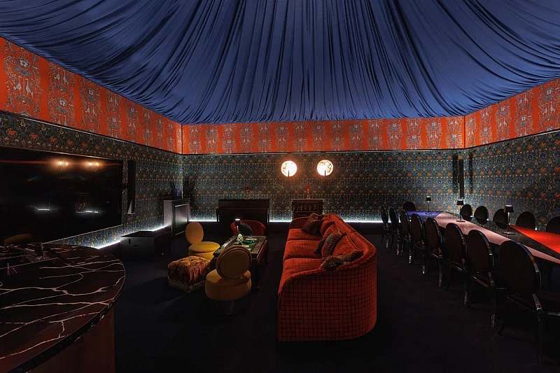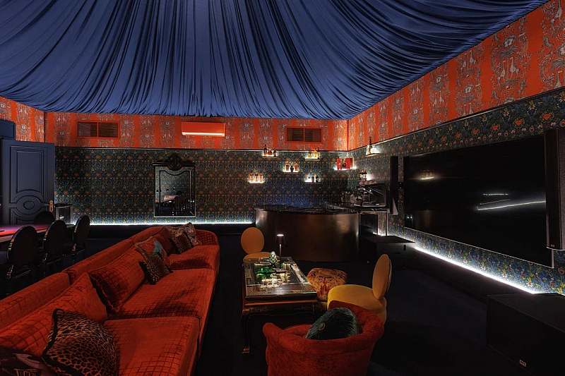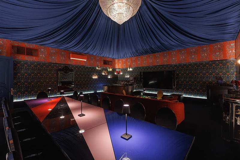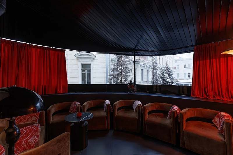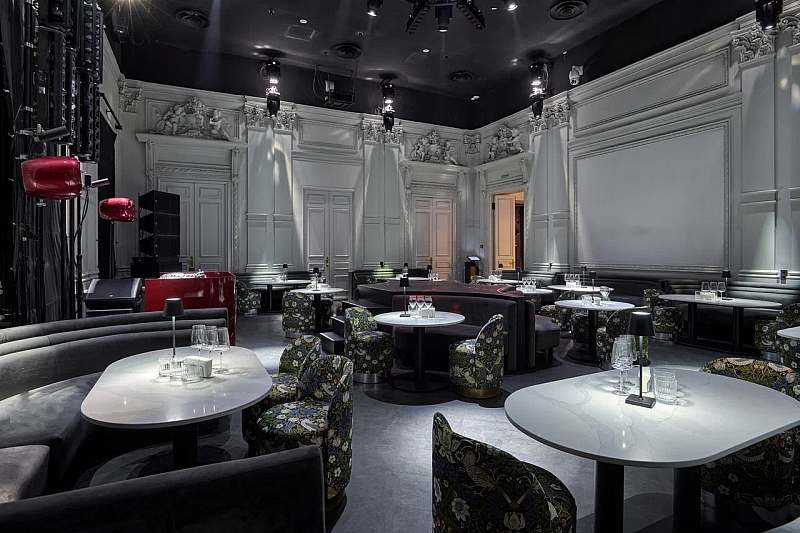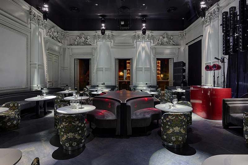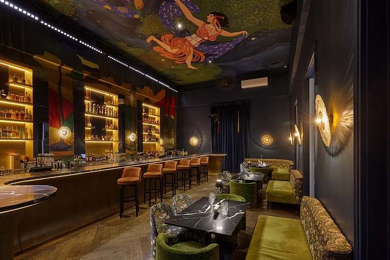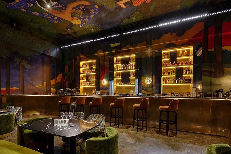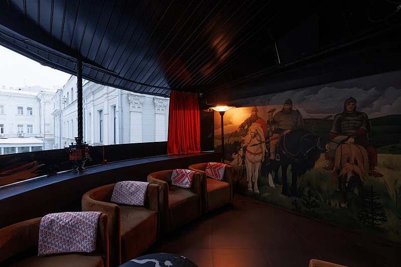 К основному залу примыкает камерное барное пространство площадью около 77 кв. м с высокими потолками и росписями в стилистике «Русских сезонов» Сергея Дягилева. Бар удобно использовать как welcome‑зону, площадку для DJ‑сета, afterparty или отдельный зал для небольших компаний.