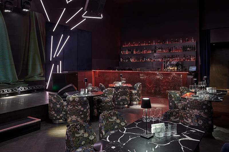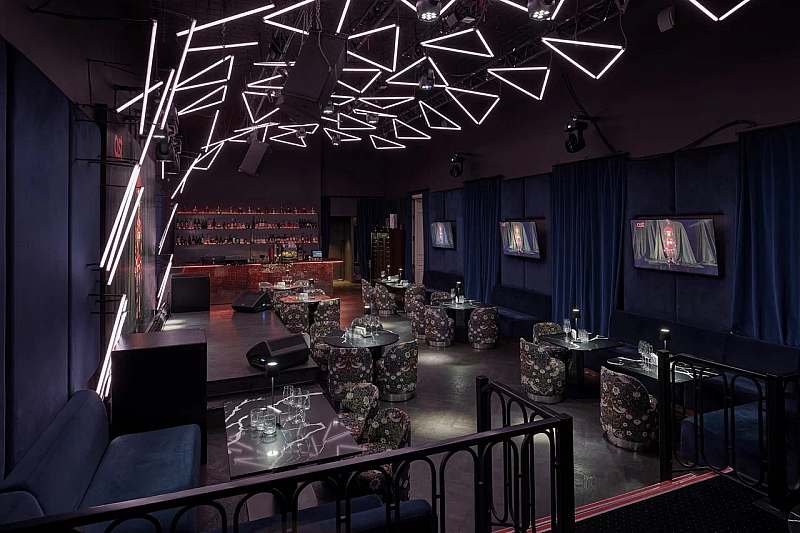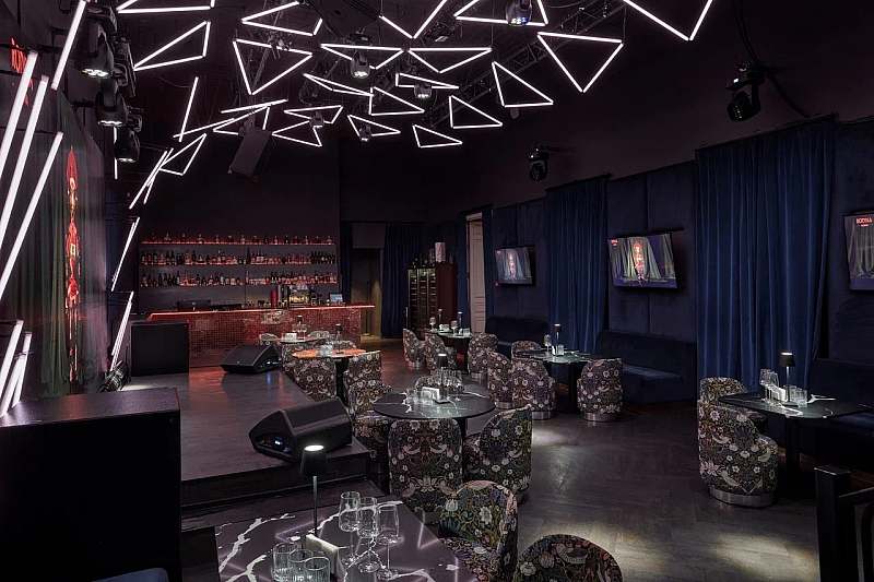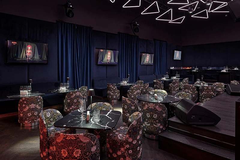 Отдельный караоке‑зал площадью примерно 140 кв. м рассчитан на банкет до 40 гостей и фуршет до 80 человек. Здесь установлена акустическая система Claire Brothers, концептуальный «парящий» потолок из светодиодных приборов, караоке‑система AST‑250, большой светодиодный экран и несколько ЖК‑панелей по периметру зала, что делает пространство удобным и для караоке‑вечеринок, и для клубных корпоративных событий.