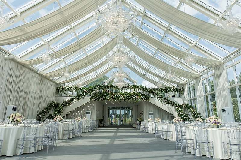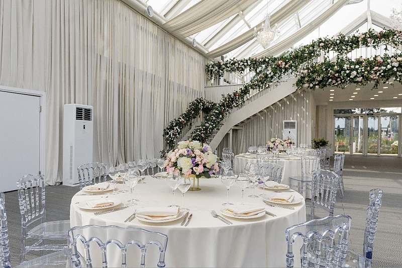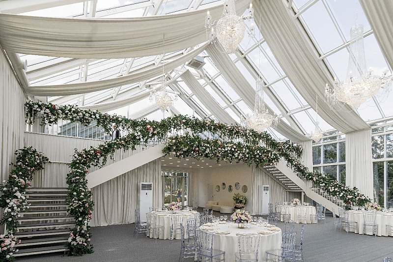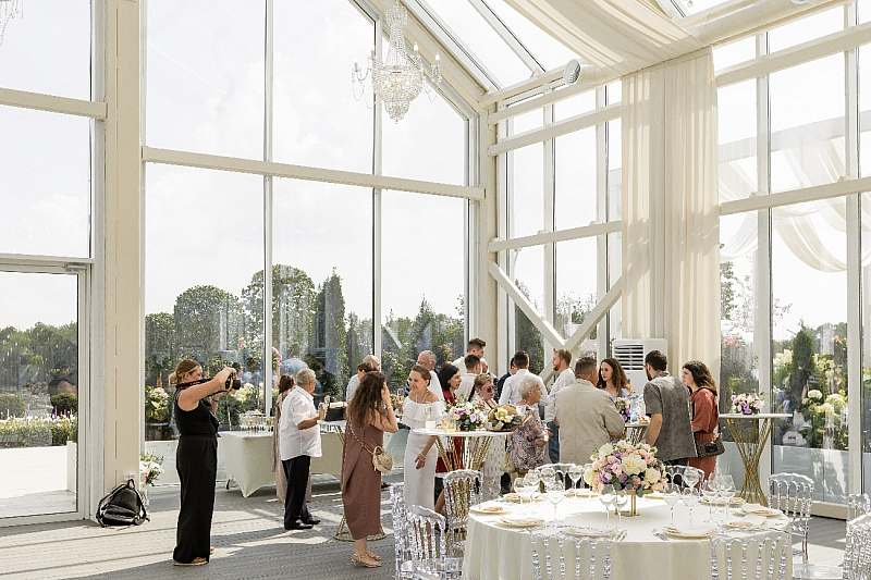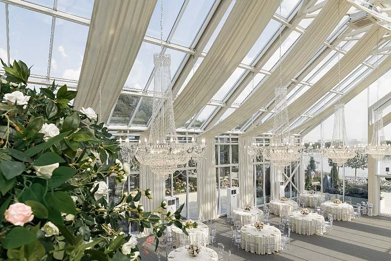 Вместимость 170 гостей банкет и до 300 фуршет: легкий стеклянный дизайн с витражным остеклением гармонирует с парком, подходит для свадеб, банкетов и корпоративов.
